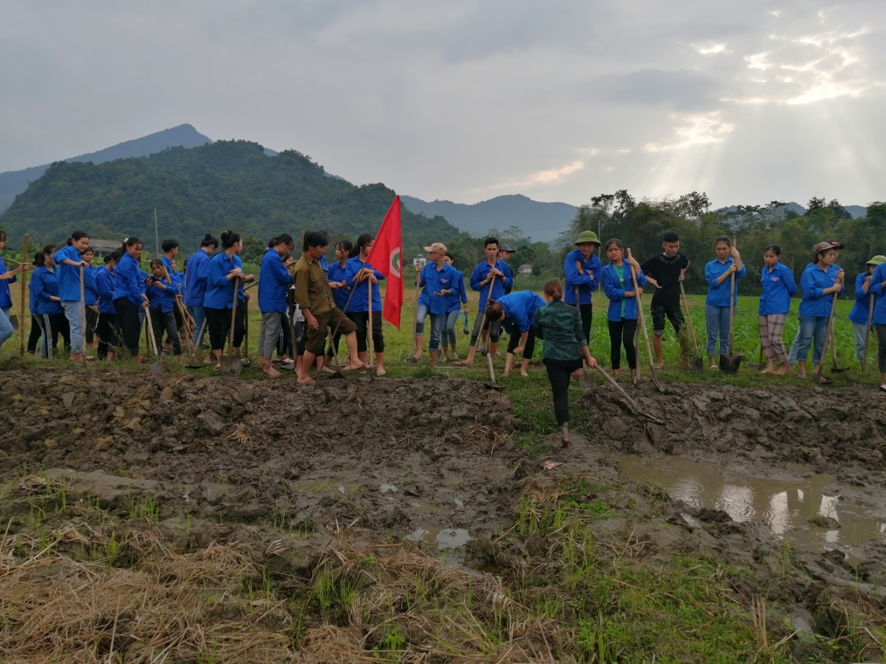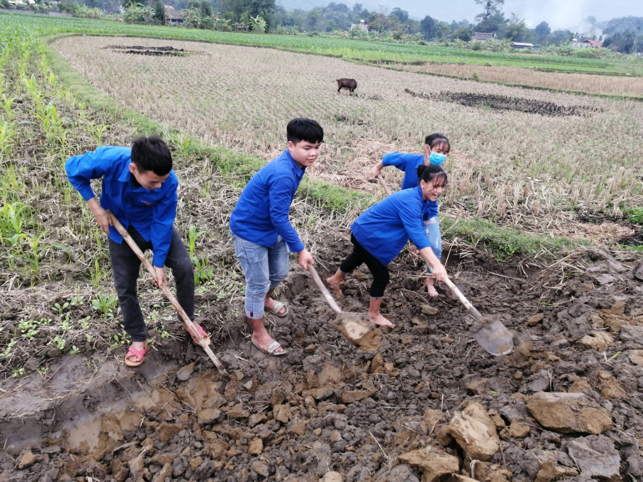 Đoàn viên thanh niên tham gia đắp lề đường nội đồng